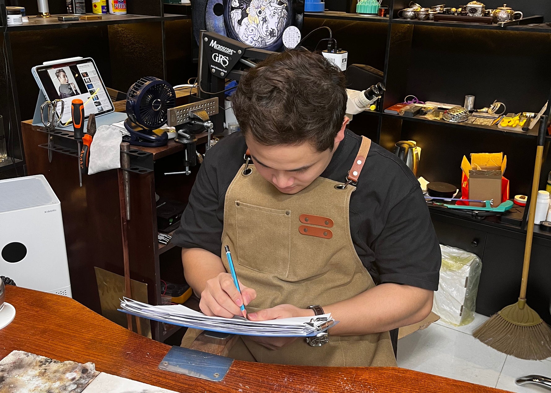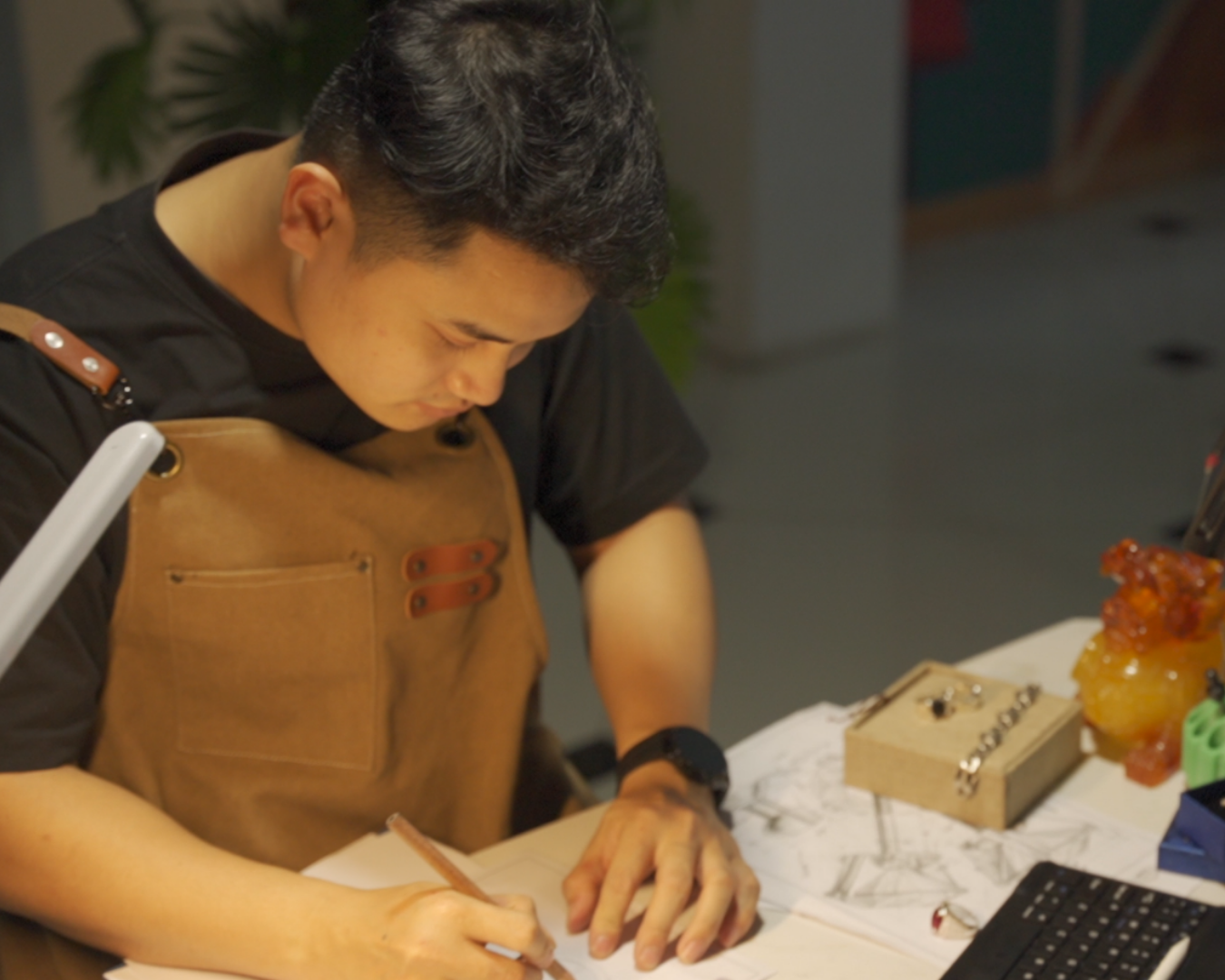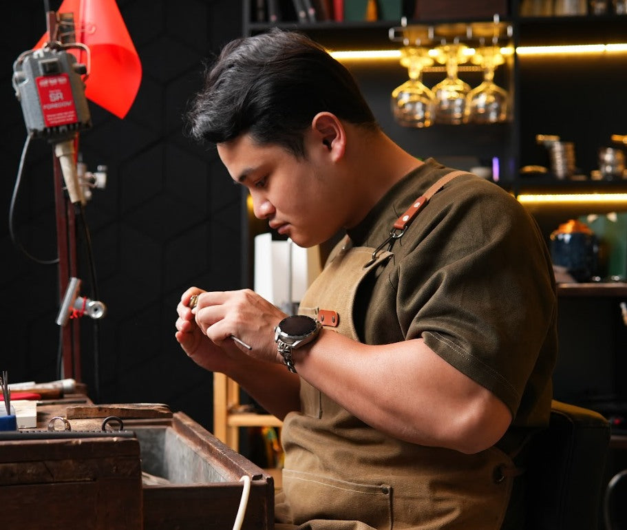 ジュエリーはただの装飾品ではありません。それは情熱と技術、そして真心の結晶です。顕微鏡を覗きながら作業する職人の姿は、HuyKが大切にする手作りの工程の一瞬を切り取ったもの。お客様の元に届くすべての作品に、私たちは完璧さと誠実さを込めています。