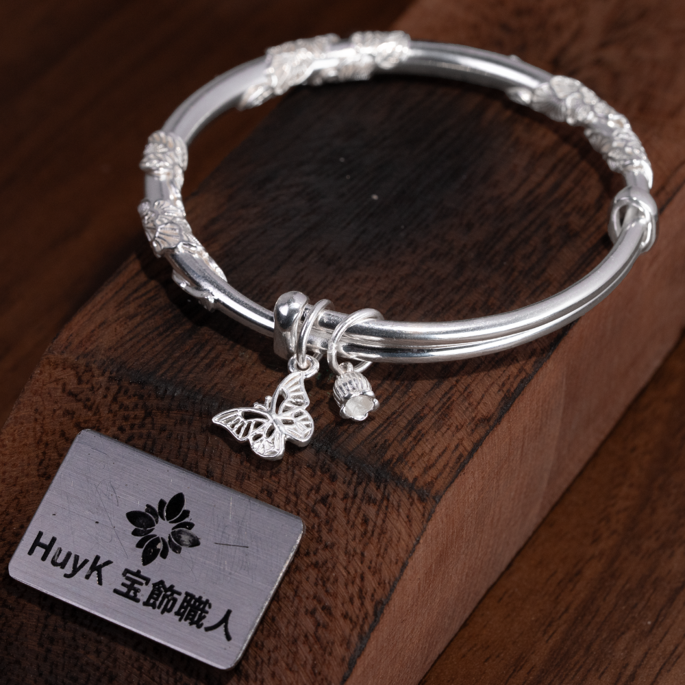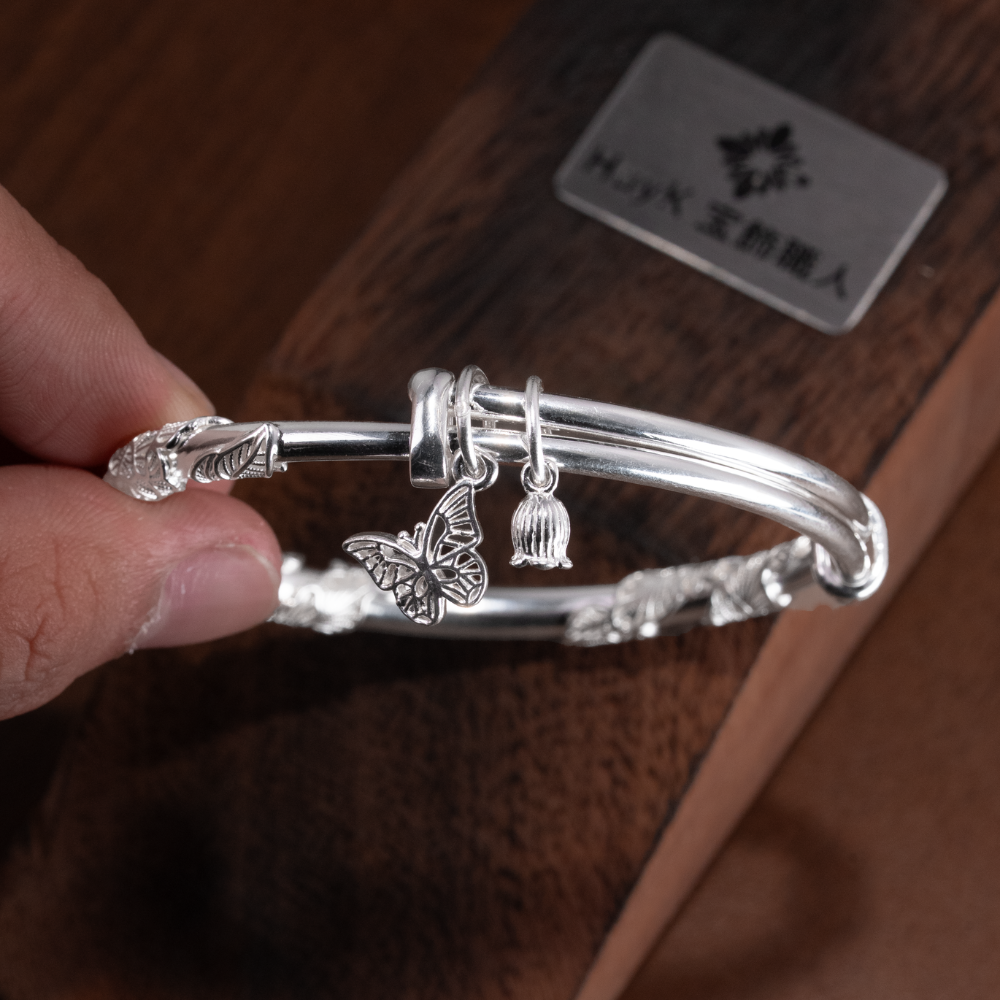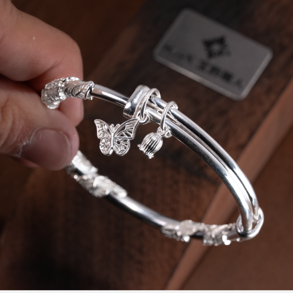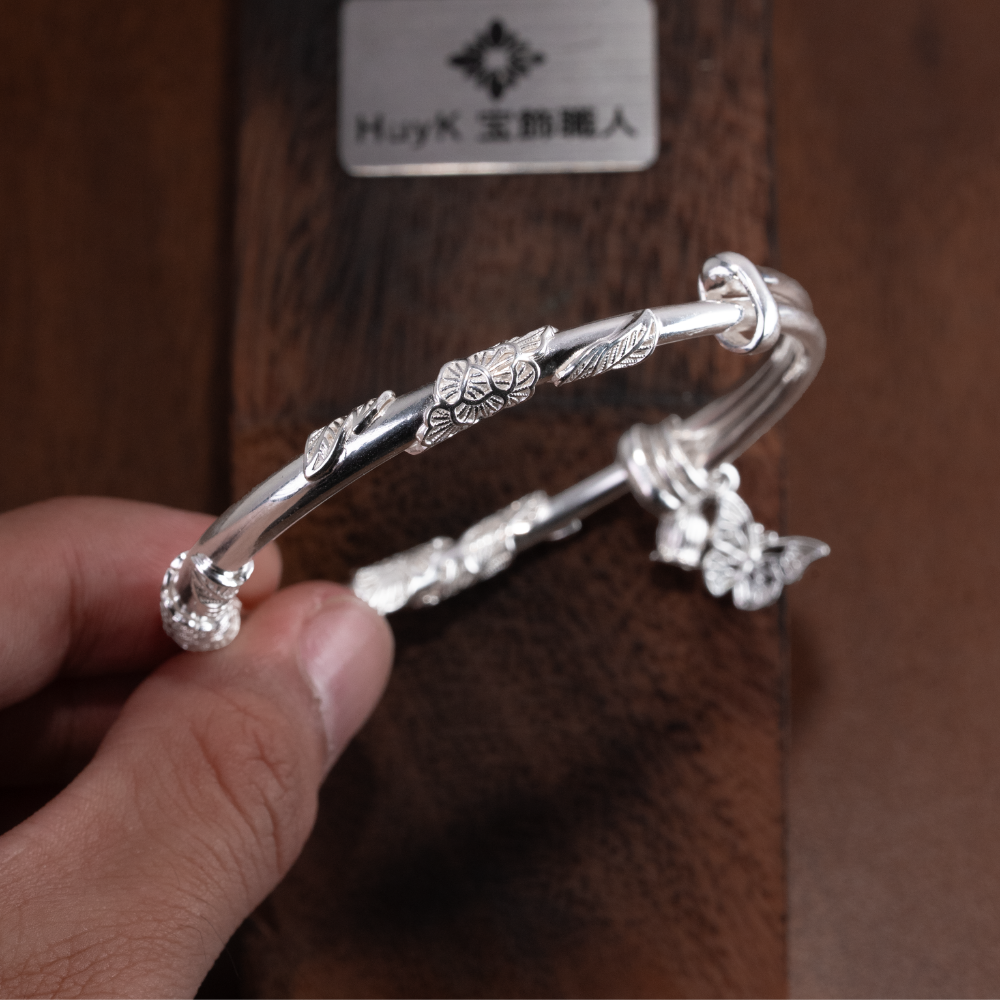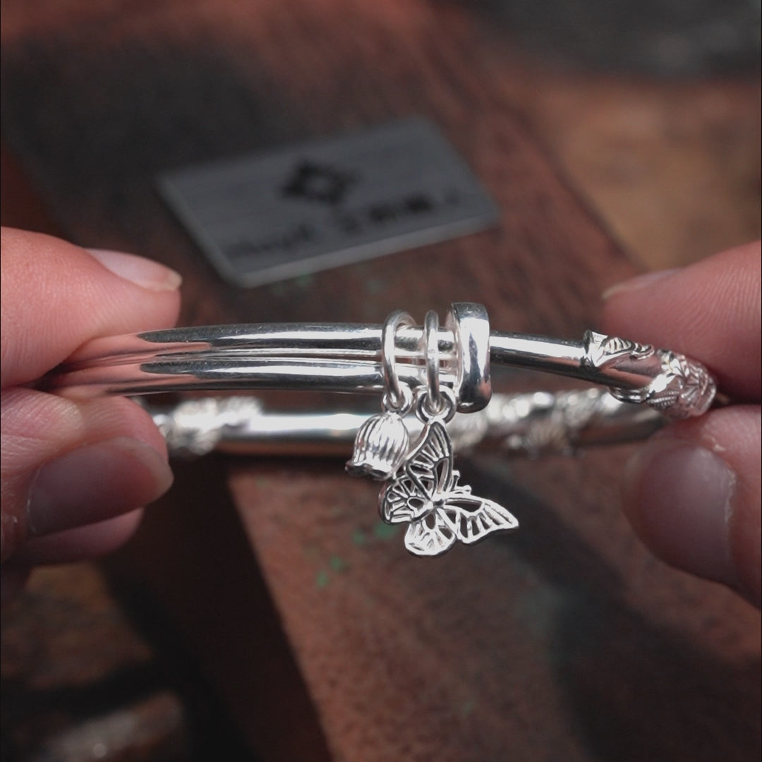 花と葉をモチーフにしたデザインに、可憐な蝶のチャームを組み合わせた純銀ブレスレットです。