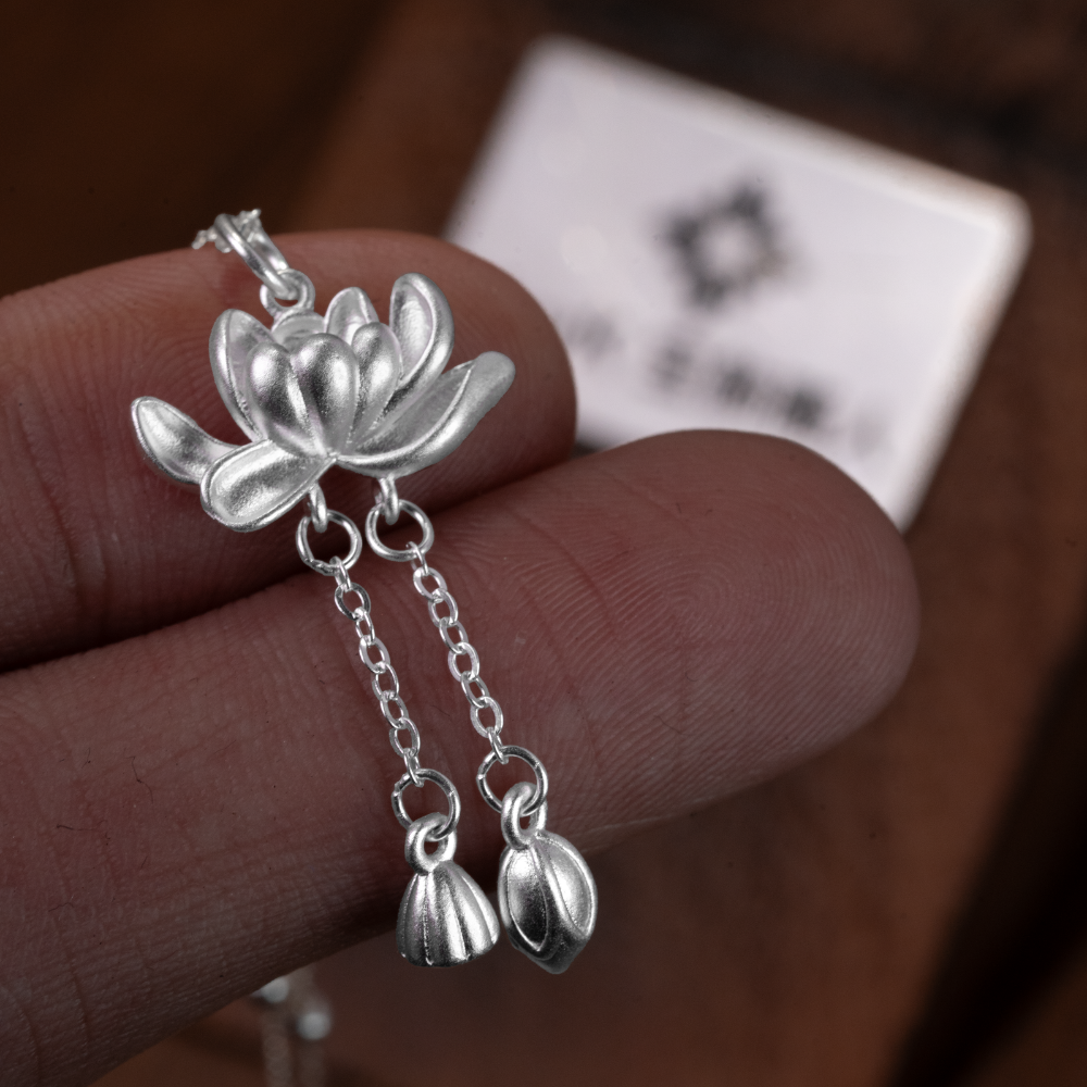 このS925シルバーネックレスは、日本文化における純粋さと再生の象徴である蓮の花からインスピレーションを得ています。ネックレスのペンダントは、中心に美しい真珠が輝く開花した蓮の花で、優雅で軽やかな印象を与えます。花の下には、細やかな蓮の花のディテールが施されており、自然の調和を感じさせる精巧なデザインです。