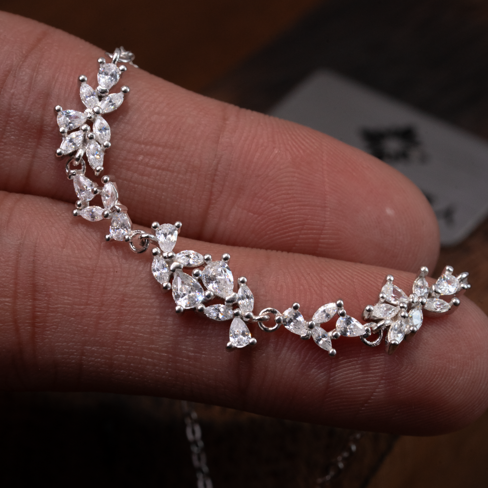 花と葉をかたどった細かなパーツが一つ一つ丁寧に組み合わされ、まるで銀のリボンが手首を包み込むような柔らかさとしなやかさを感じさせます。