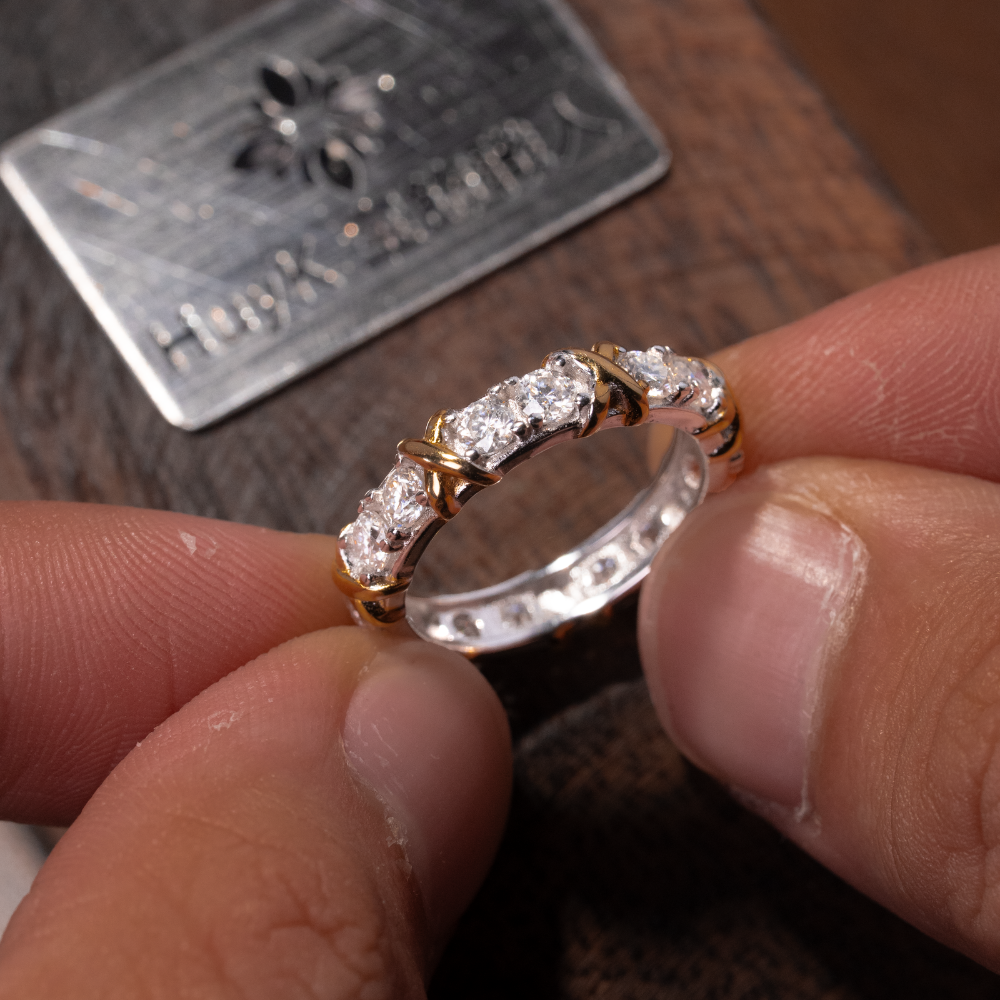 「ハグ&キス(Hug & Kiss)」を意味する“XO”モチーフがリング全体を優しく包み込み、永遠の愛と絆を象徴するロマンチックなデザインです。ひとつひとつのモアサナイトは、職人の手によって丁寧にセッティングされ、まるで本物のダイヤモンドのように眩い輝きを放ちます。